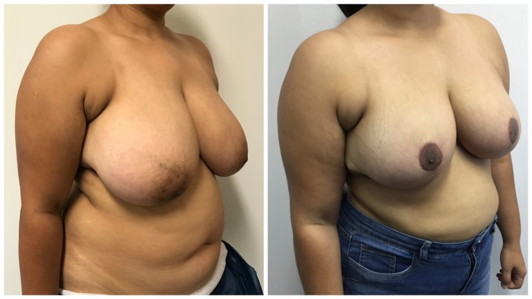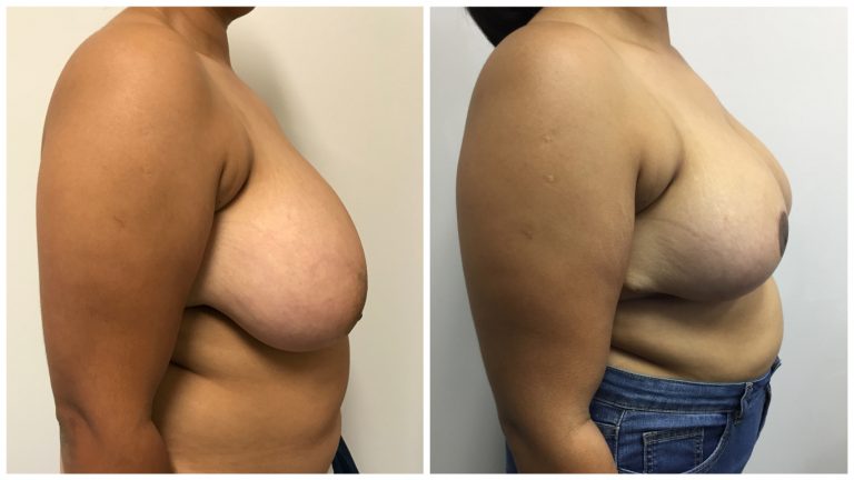 Patient 9 : 38 year old female patient underwent a Bilateral Breast Reduction + Fat Graft to Breasts. Macromastia with 458g taken out of Right Breast and 416g taken out of Left Breast. 180cc of fat was transferred into each breast. Post operative photos taken at 5 months.