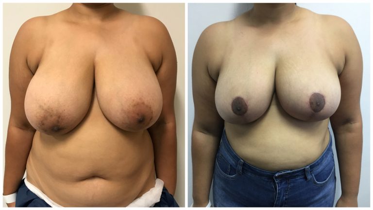 Patient 10 : Patient underwent a Bilateral Breast Reduction + Fat Graft to Breasts. Macromastia F/G cup breasts with 368g taken out of Right Breast and 320g taken out of Left Breast. 100cc of fat was transferred into each breast. Post operative photos taken at 3 months.