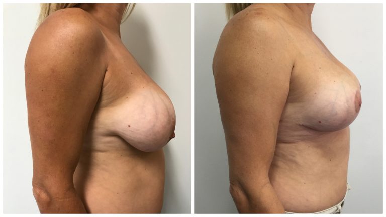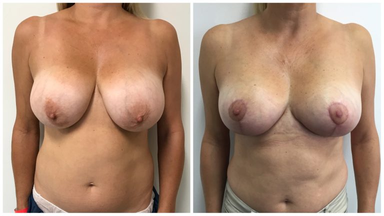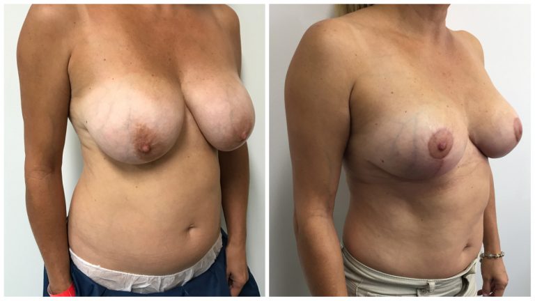 Patient 12 : 47 year old female patient underwent a Bilateral Breast Reduction + Fat Graft to Breasts. Macromastia E/F cup breasts with 341g taken out of Right Breast and 327g taken out of Left Breast. 150cc of fat was transferred into each breast in the upper poles/cleavage area. Post operative photos taken at 3 months.