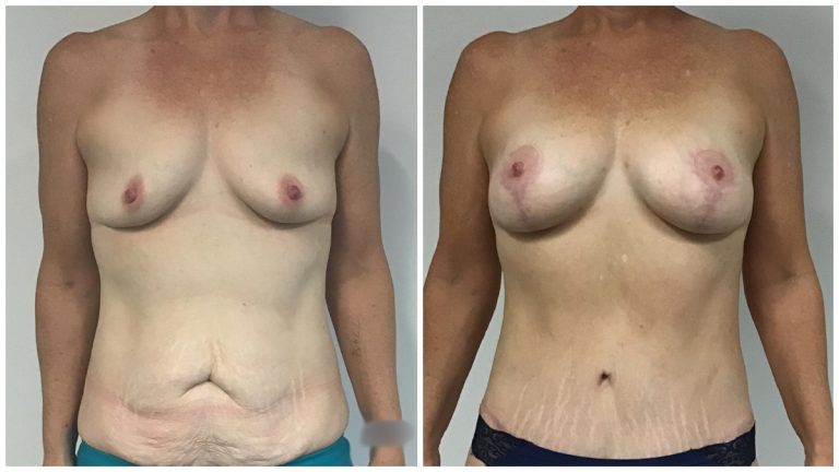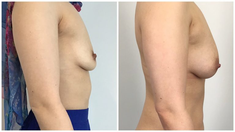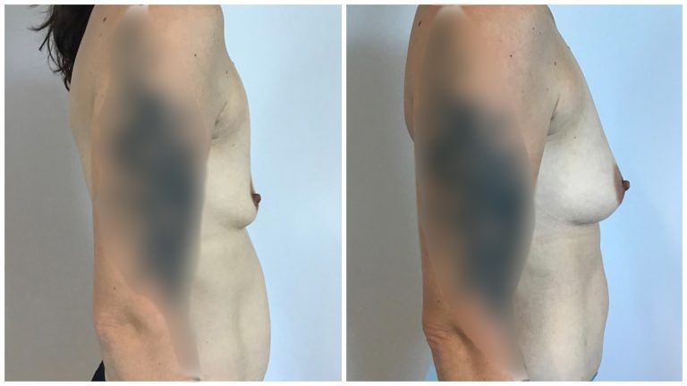 Patient 43 : 48 year old female patient underwent 2 stages of Fat Transfer to the Breasts + MAstopexy. 230cc of fat was transferred into each breast during 1st stage. 200cc was transferred into Right Breast and 150cc was transferred into Left Breast during 2nd stage. Post operative photos were taken at 6 weeks for both stage 1 and 2.