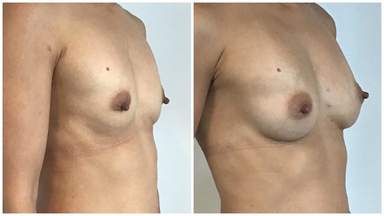 Patient 47 : 35 year old female underwent 2 stages of Fat Transfer to Breasts. 180cc of fat was transferred into Right Breast and 130cc was transferred into Left Breast during 1st stage. 180cc of fat was transferred into each breast during 2nd stage. Post operative photos taken at 3 months post each stage.