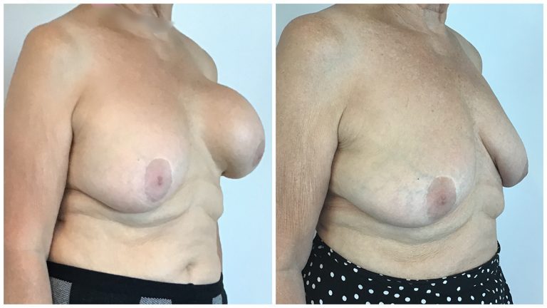 Patient 1 : 70 year old female patient underwent Removal of Implants with Capsulectomies due to left capsular contracture. Postoperative photos taken at 6 weeks.