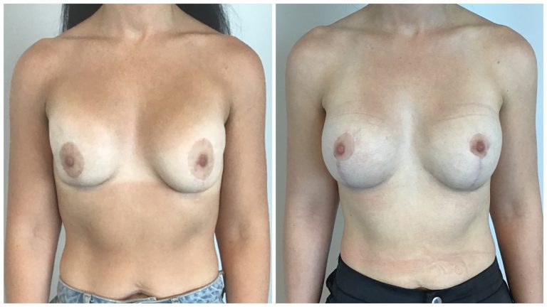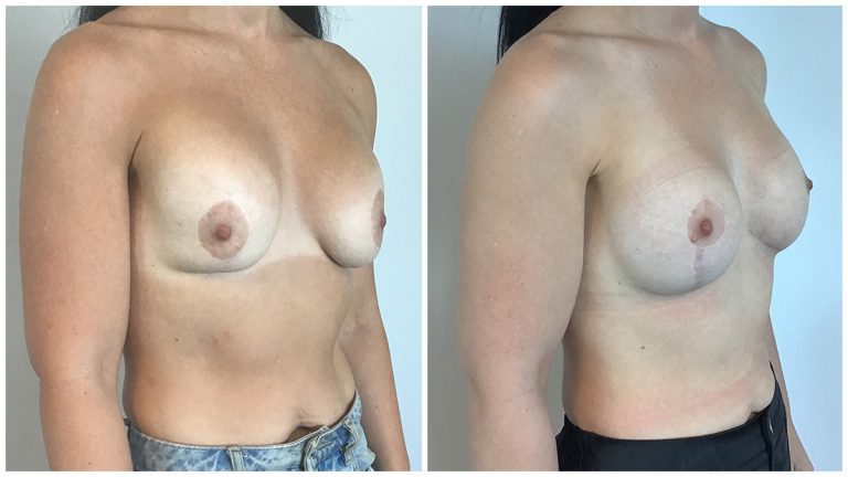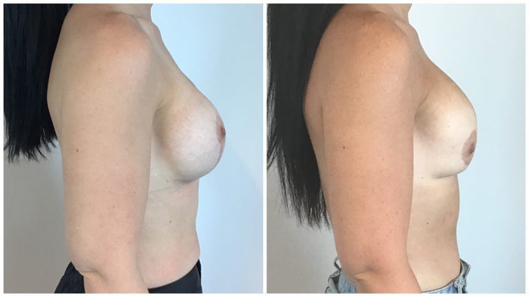 Patient 29 : 41 year old female underwent Remove & Replace of Implants + Mastopexy using 500cc round implants. Left ruptured implant. Postoperative photos taken at 6 weeks.