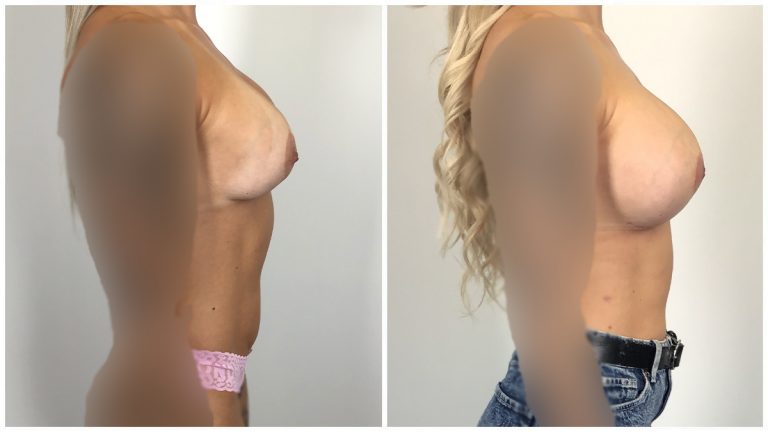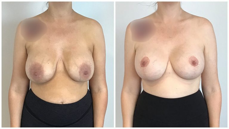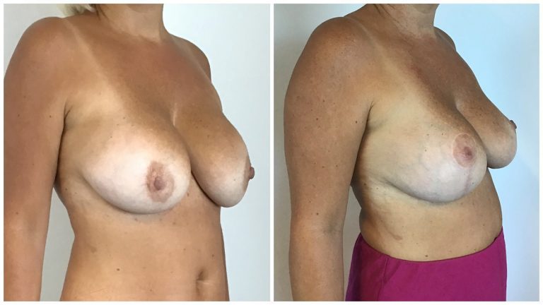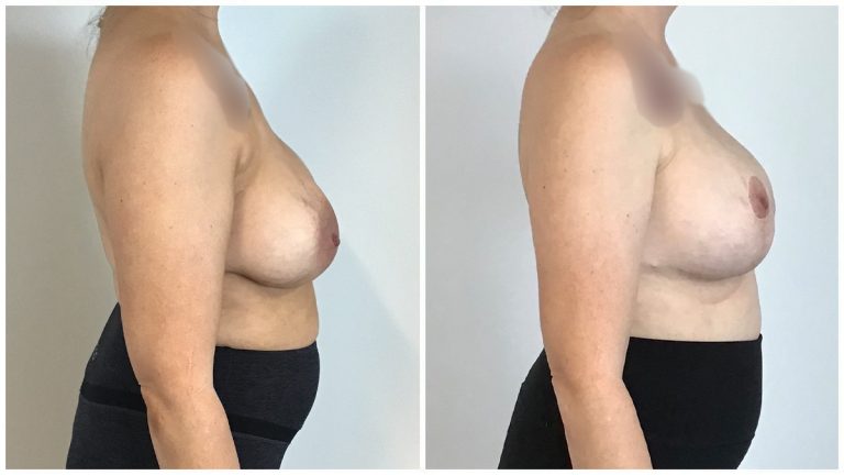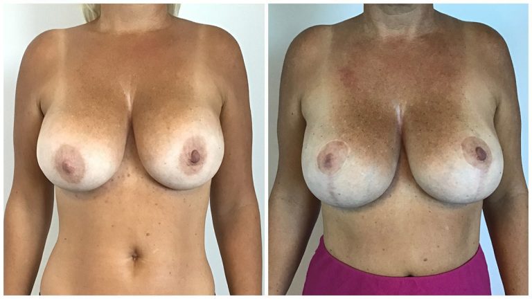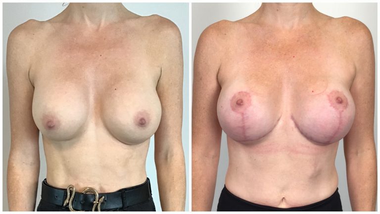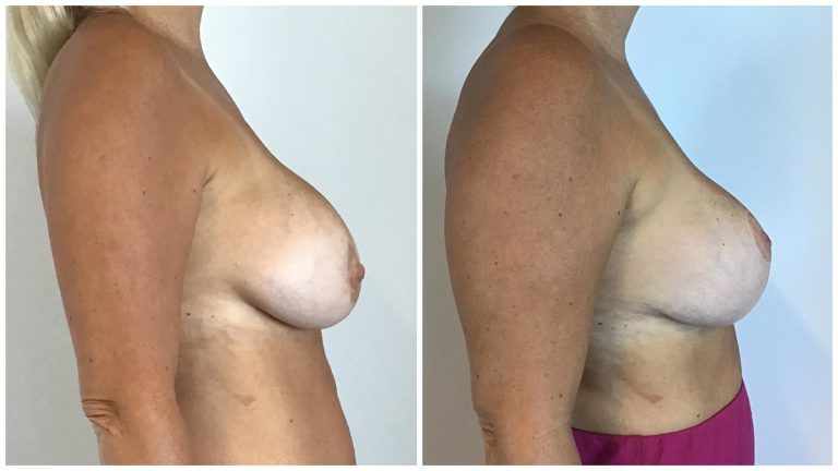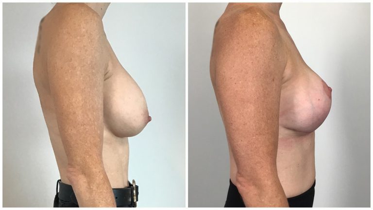 Patient 32 : 46 year old female patient underwent Remove & Replace of Implants + Mastopexy using 355cc round implants. Postoperative photos taken at 8 months.